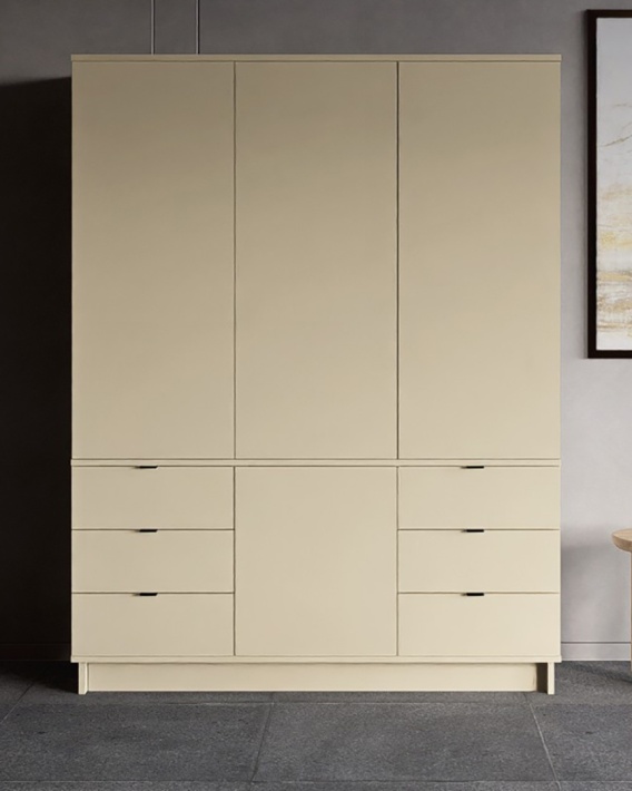 Szeroka, trzykolumnowa szafa z nadstawką. Szafki i szuflady w dolnym poziomie. Wymiary, kolory i drewnopodobne dekory do indywidualnej konfiguracji. Wybierz: podstawę, półki lub drążek, rodzaj uchwytów i stwórz idealną szafę.
