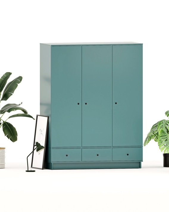 Szeroka, trzykolumnowa szafa z trzema szufladami w pierwszym poziomie. Wymiary, kolory i drewnopodobne dekory do indywidualnej konfiguracji. Wybierz: podstawę, półki lub drążek, rodzaj uchwytów i stwórz idealną szafę.